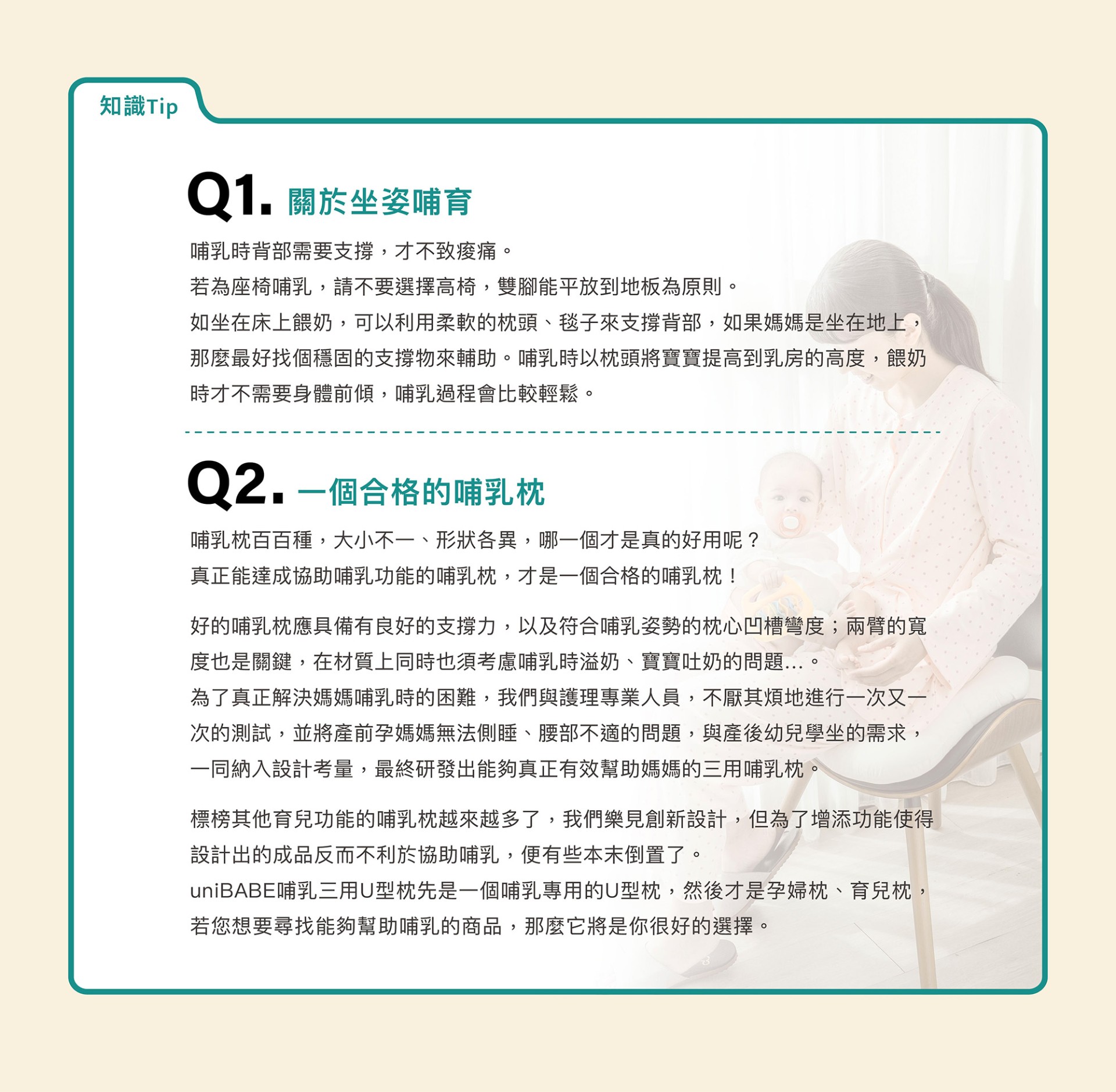 與護理專業人員合作設計,幫助媽咪解決從孕期、哺乳到寶寶學坐需求,解決產前臥床腰部不適、無法側睡,及哺乳手臂痠痛問題。
