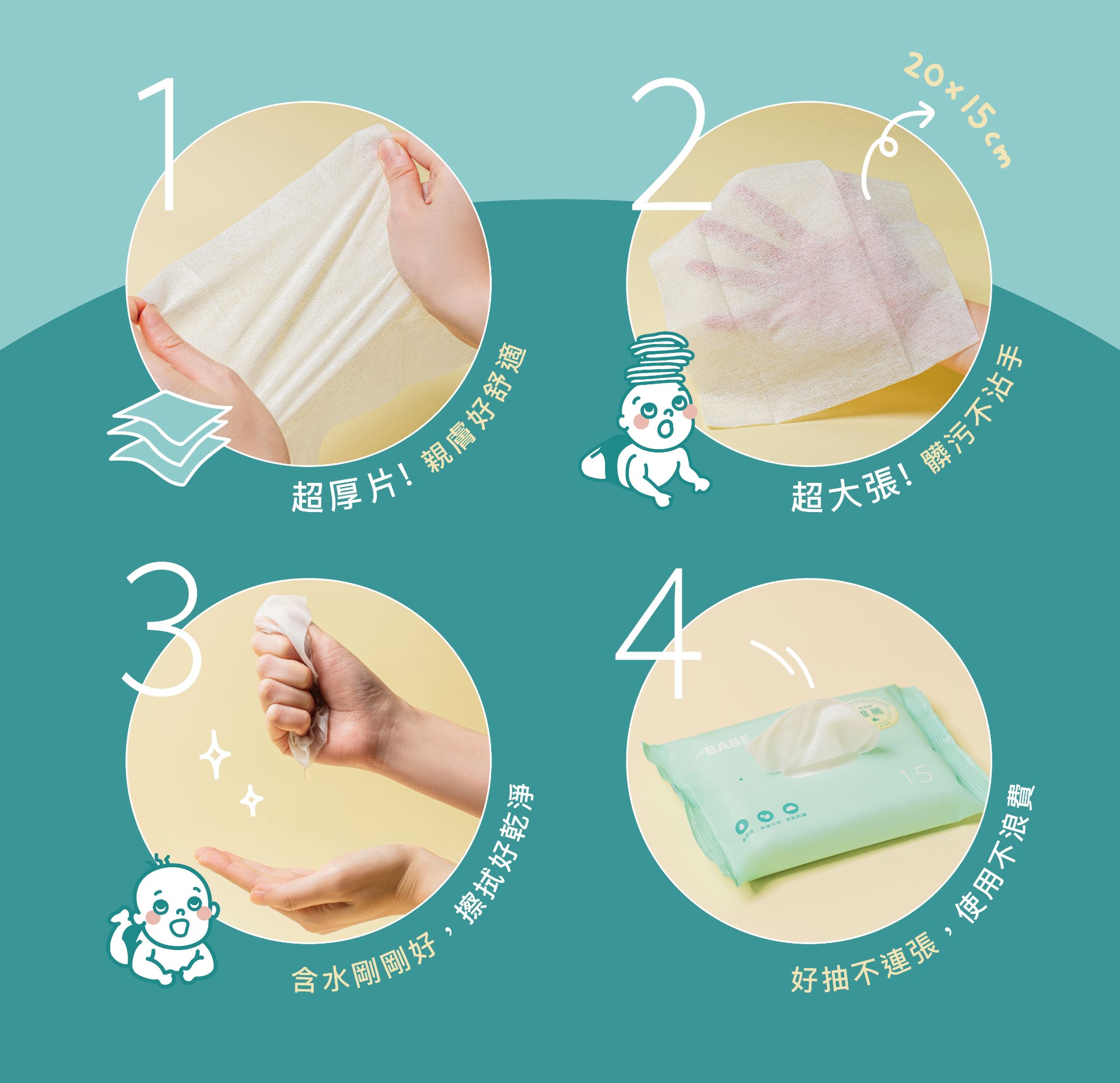 注意事項:請放置陰涼處,避免高溫及陽光直接照射。請放在幼兒無法取得處,避免幼兒誤食。本濕巾非水溶性,請勿丟入馬桶。肌膚有傷口、紅腫、濕疹及其他不適症狀時請勿使用。