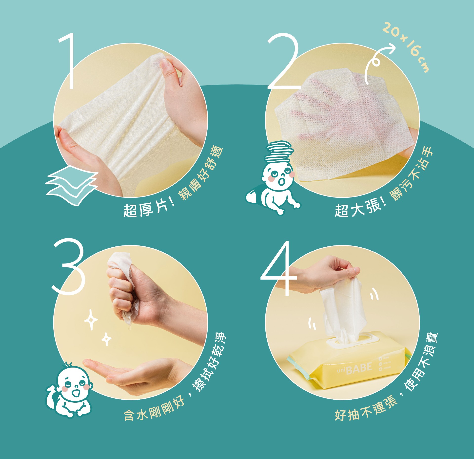 符合衛署標準,嬰兒專用;尺寸大張,超厚超柔親膚舒適,定期SGS檢驗好安心。貼心上蓋設計,密封性佳易保存;好抽不連張,一次一張使用好便利。