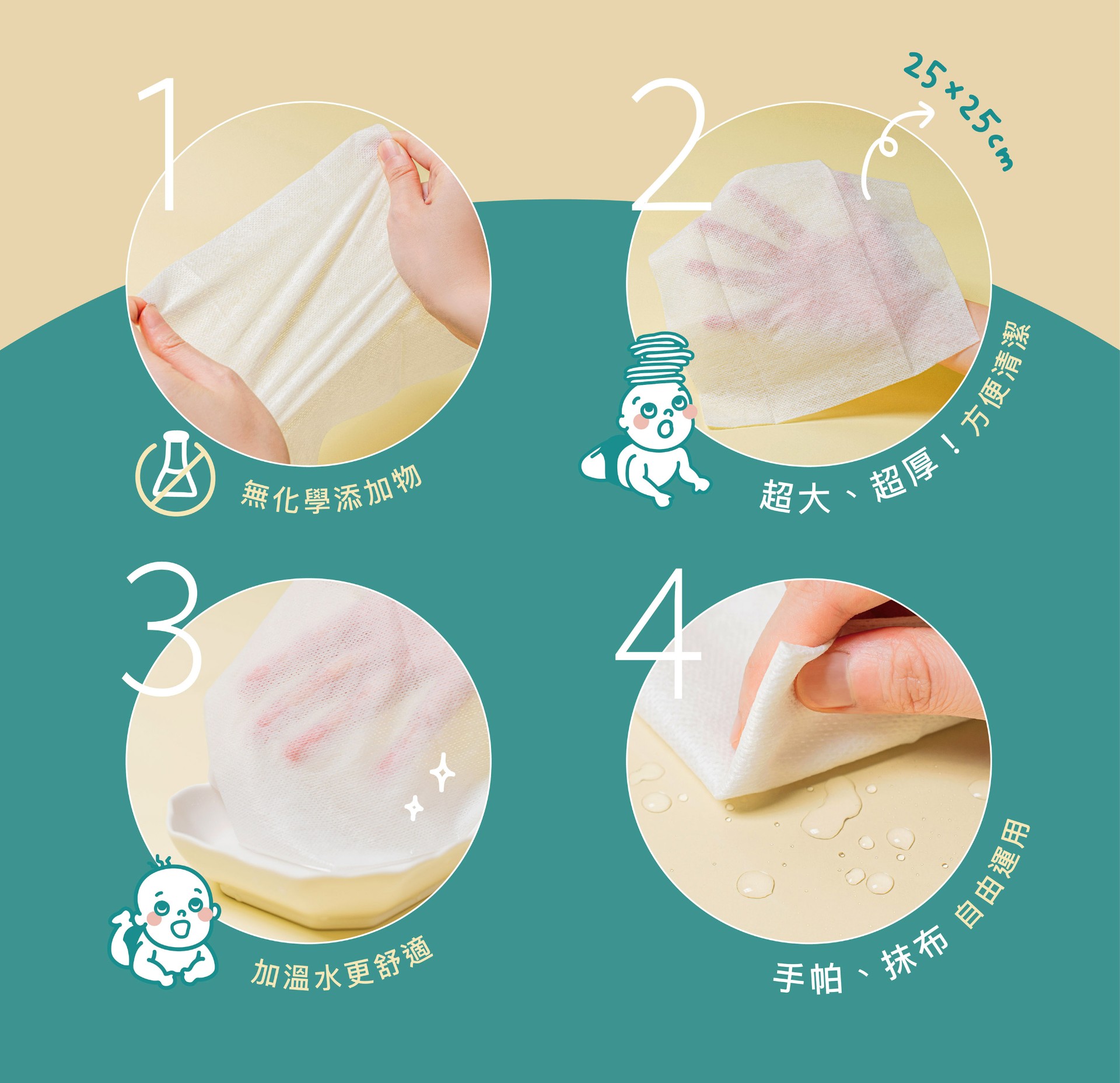 加水即是濕巾,可以自由調整需要的濕度、溫度,特大張25cm*25cm規格設計,不加水也可當乾抹布、拋棄式手帕使用;最重要的是因為製作過程中不需要進行防腐、保濕處理,故可以避免接觸化學添加物質,絕對是您最好的選擇。